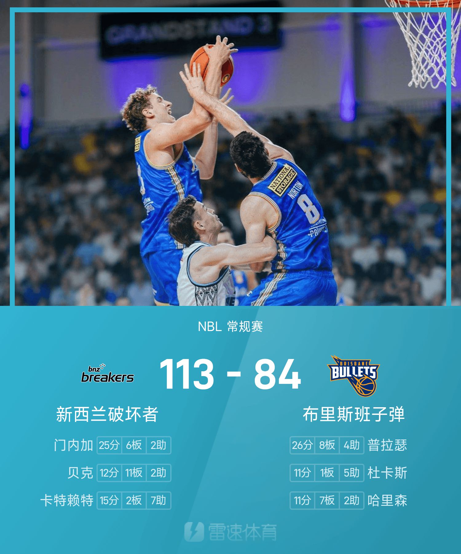 NBL战报:门内加25分6板,新西兰毁坏者113-84大胜布里斯班子弹