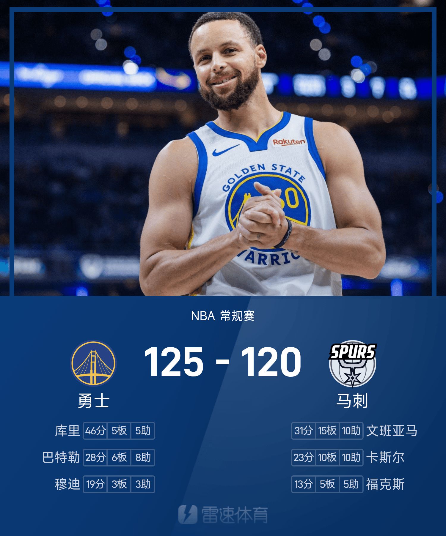 NBA战报:库里46分,文班空砍三双,勇士125-120马刺