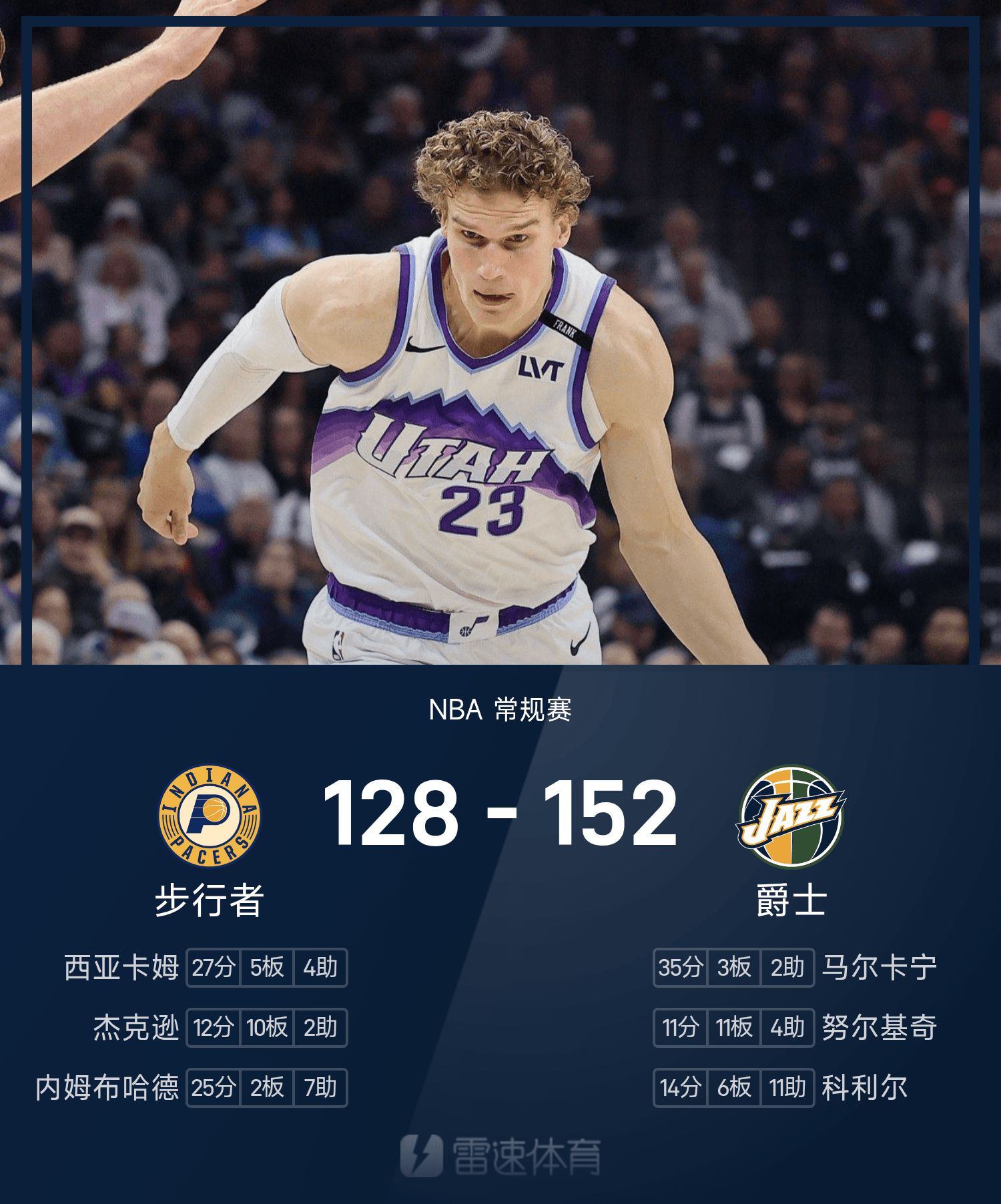 马尔卡宁砍下35分,率队轰出152分大胜步行者。