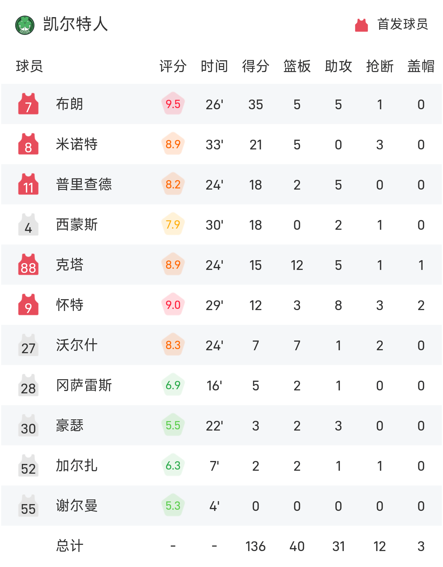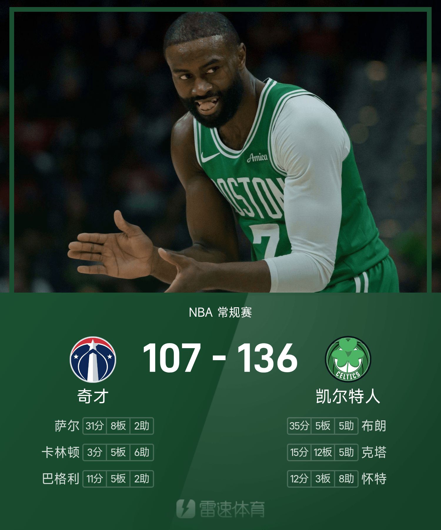 NBA战报:布朗35分,凯尔特人136-107大胜奇才