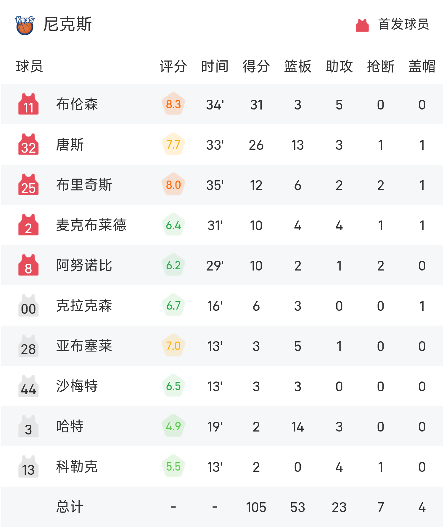 6686体育app10月25日讯 25/26赛季NBA常规赛,尼克斯对阵凯尔特人。双方全场战罢,尼克斯105-95战胜凯尔特人。布伦森砍下全场最高的31分3板5助,率领尼克斯胜利取胜。