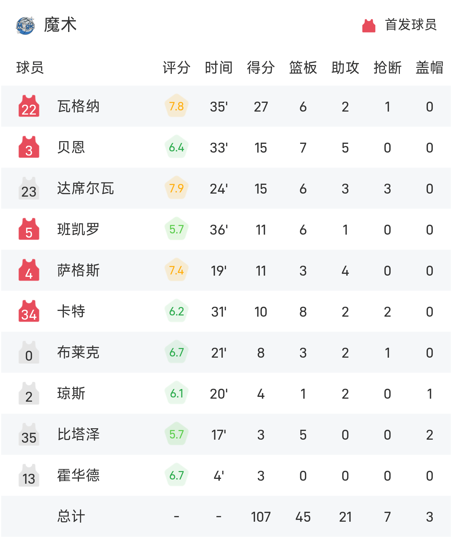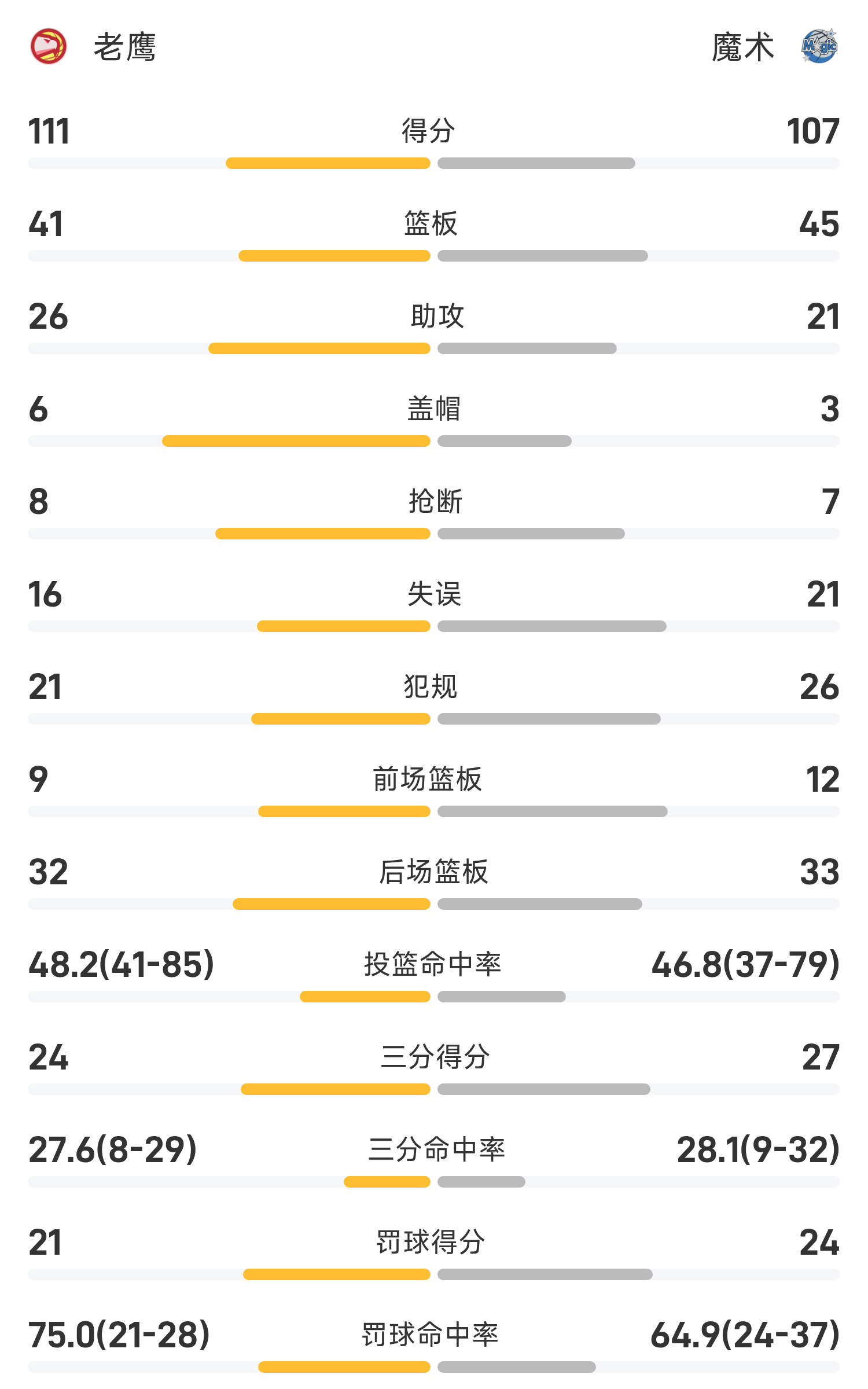 6686体育app10月25日讯 25/26赛季NBA 常规赛,魔术对阵老鹰。双方全场战罢,魔术107-111不敌老鹰。特雷杨得到25分1板6助率队取胜,瓦格纳空砍全场最高的27分6板2助。