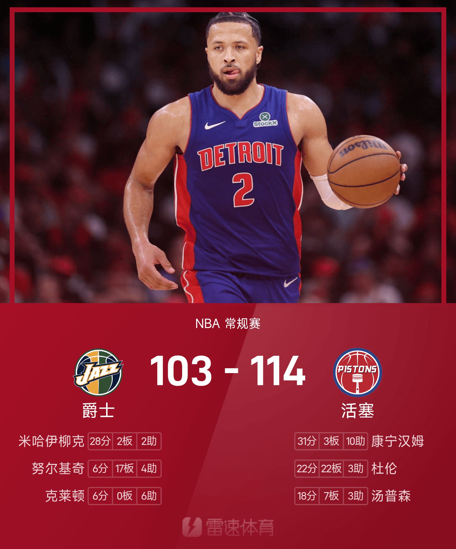 6686体育app11月06日讯 25/26赛季NBA 常规赛,活塞对阵爵士。双方全场战罢,活塞114-103战胜爵士。康宁汉姆砍下全场最高的31分3板10助,率领活塞胜利取胜。