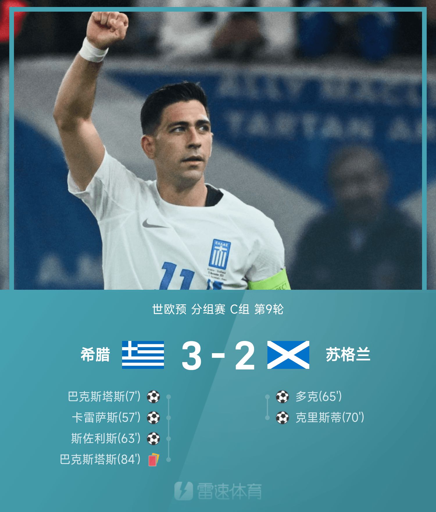 6686体育app11月16日讯 26赛季世欧预分组赛C组第9轮,希腊3-2战胜苏格兰。全场竞赛,巴克斯塔斯传射建功后染红,斯佐利斯、卡雷萨斯破门建功,多克、克里斯蒂连扳两球难救主,苏格兰错失直通先机。
