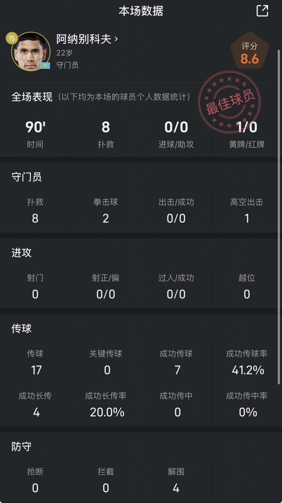 6686体育app11月15日讯 世欧预J组第9轮,哈萨克斯坦在主队场以1-1的赛果分战平比利时。哈萨克斯坦守门员阿纳别科夫发挥神勇,全场完成8次救球。