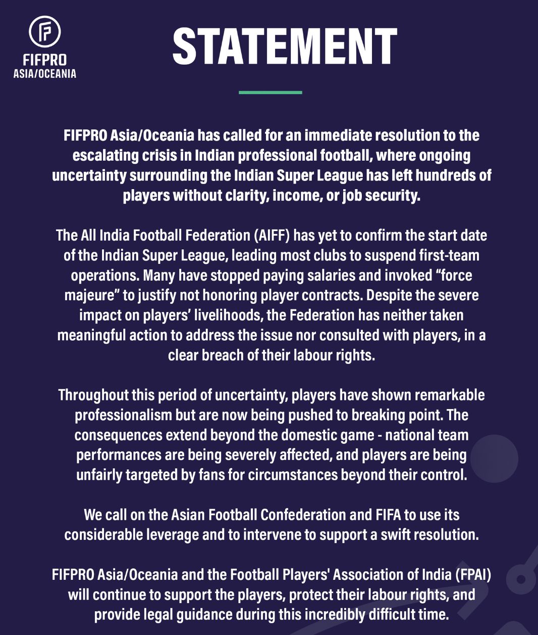 “FIFPRO亚洲、大洋洲分会呼吁,立即解决印度职业足球日益严重的危机。印度超级联赛事持续不断地不确定性,导致数百名职业球员面临前途未卜、收入锐减、生活保障欠缺的困境。印度足球联合会(AIFF)至今尚未确定印度超级联赛事的开赛日期,大多数俱乐部叫暂停一线队运营。许多俱乐部停顿支付球员薪水,并以‘不可抗力’为由,拒绝履行球员的合同”。