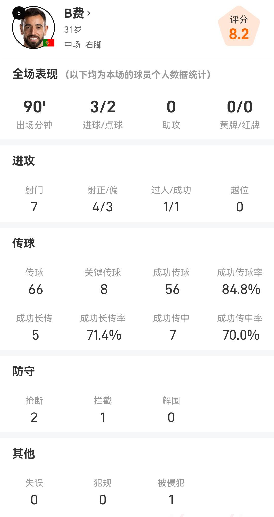 本场竞赛,B费首发出战并打满全场,表现十分出色。在攻击端,B费打进了3球,全场竞赛共有7次打门,其中4次射正,还有1次胜利过人。