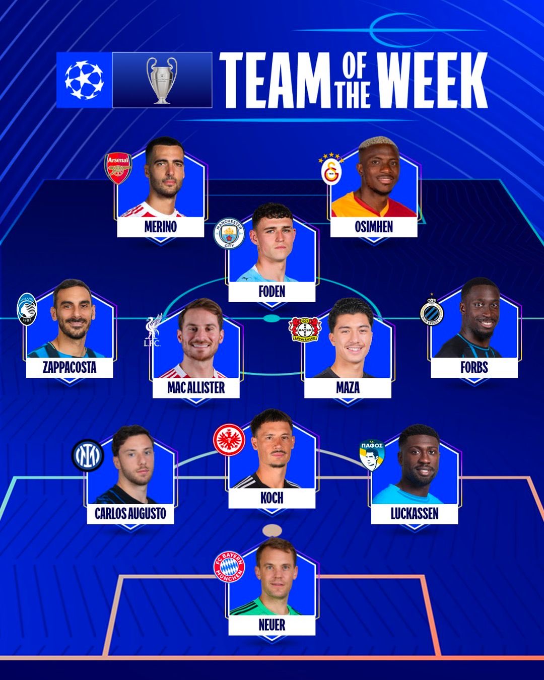 6686体育app11月7日讯 欧足联官方公布了联赛事阶段第四轮的周最佳阵容,奥斯梅恩、诺伊尔领衔该榜单,福登、麦卡利斯特、梅里诺在列。