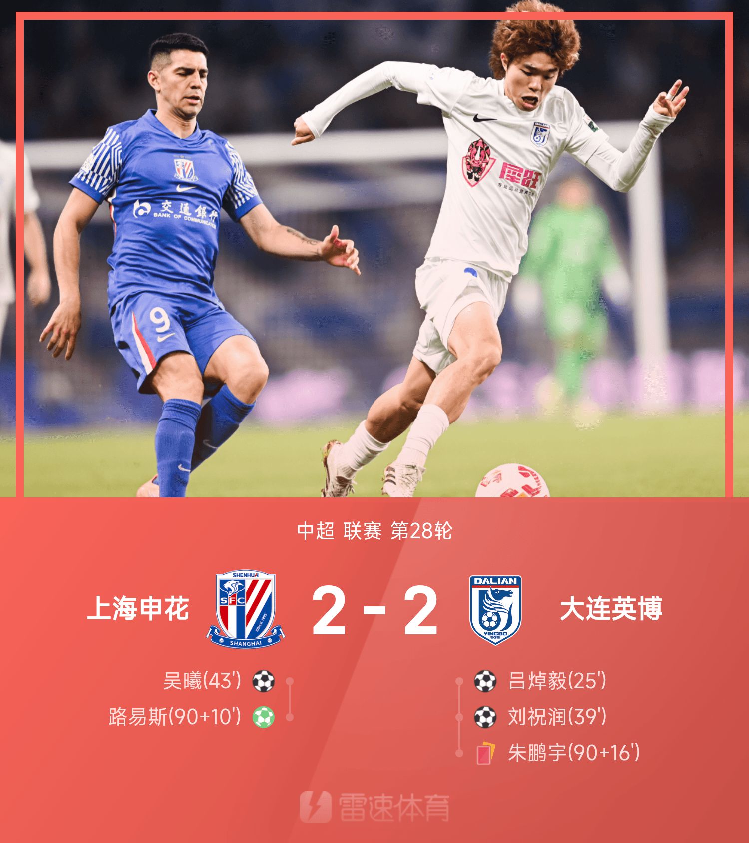 6686体育app10月26日讯 25赛季中超联赛事第28轮,上海申花2-2战平大连英博。上半场,吕焯毅打出世界波为大连英博取得领跑位,刘祝润扩展领跑位优势,吴曦为申花扳回1球;下半场,视频裁判多达4次介入,吴曦和汪海健击中横梁,补时阶段,视频裁判介入吴曦造点胜利,路易斯主罚完成绝平,上海申花最终2-2战平大连英博,距离榜首2分。